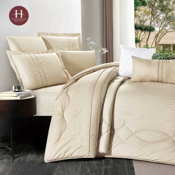 Upgrade your bedroom with the Calvo 6-piece compressed quilted comforter set, featuring a classic striped hotel-style design and made for comfort and elegance. The heavy quilted comforter is perfect for cooler nights, combining warmth with a sleek, modern look.